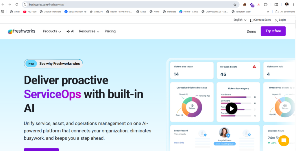Think of Freshservice as Freshdesk’s more serious sibling designed specifically for internal IT support. It follows ITIL principles — which is just a structured way of managing IT incidents, problems, changes, and assets — without making it complicated to set up.